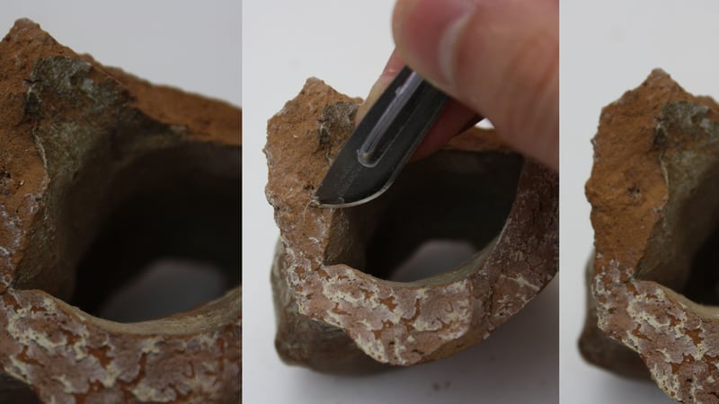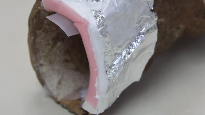 After the sections were bonded with Paraloid B-72 in acetone (35%) a support fill was added to the base area. The same adhesive used for bonding was bulked with glass microspheres to make a removable fill. The area was sealed with aluminium foil and a dental wax mould was put in place as a support. The microspheres paste was then applied and let to dry. By doing a fill in this way I could then safely shape and sand it far away from the original. After completely dried, the fill was skimmed with fine calcium carbonate putty and attached to the figurine with the same adhesive.