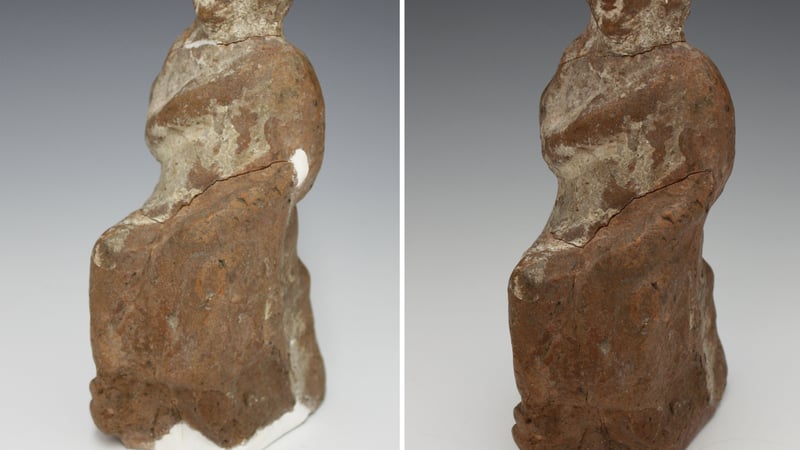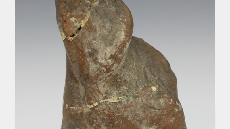 Excavated in Great Henny, near Colchester (Suffolk), a well-known Roman settlement in the UK, we could easily attribute its making to that empire. However, in-depth research must be done prior to those affirmations. If Roman or even brought to England at that time, these figurines were commonly made as votive objects in homes or temples. It is a draped sitting female figure with head decoration and her arms close to the body suggesting a pudicitia, representation of modesty during the Roman Empire.