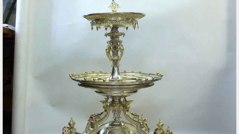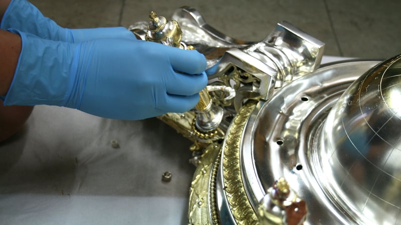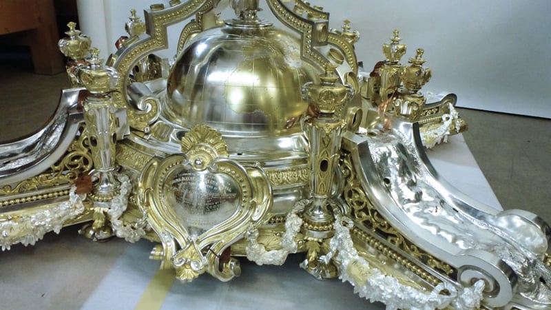 I have not been acting alone. Since work began in earnest on this project, I have had an amazing team of willing helpers in the form of six other Graduate and Postgraduate Diploma metals conservation students. I have never had to head a team working on an object before and I'm enjoying it far more than I thought I would. Despite the stresses of keeping everyone informed, happy, and busy, dealing with problems as they arise, coordinating multiple ongoing processes and carrying out my own workload, having a team around me is proving to be a positive experience. The rest of the team have helped me to stay motivated, supported me at stressful moments and, best of all, changed the rate of progress on the object from a snail's pace to leaps and bounds. There is still plenty of work to be done but the end is in sight and I am looking forward to seeing the Croll in all its gilded, polished, frosted, engraved, bejewelled and utterly extravagant glory.