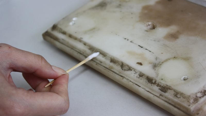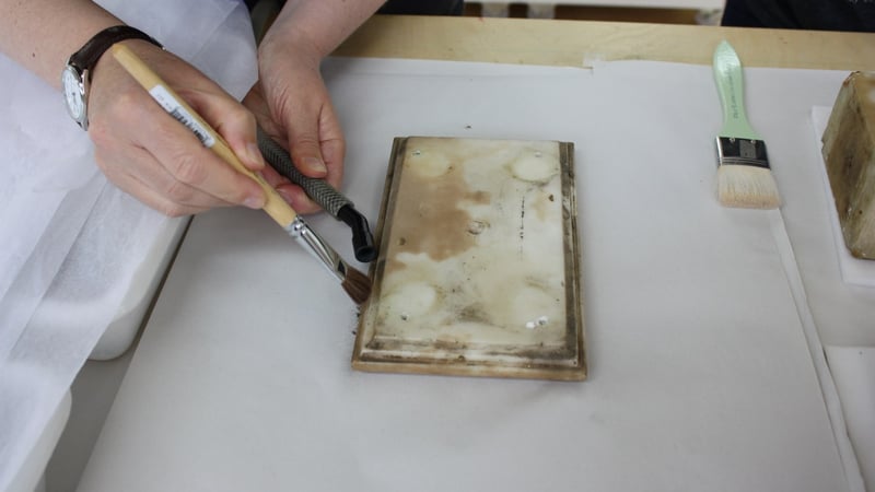First, surface dust was removed using brushes and a museum vacuum. We then carried out wet cleaning; however, strong solvents were not used to avoid any risk of removing the wax coating. We used water, Synperonic A7 (non-ionic detergent diluted 1:20 in water) and diluted Biotex (enzyme washing powder) in water using cotton wool swabs.