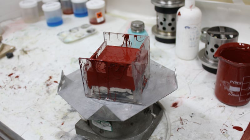 Then we poured a second 200ml batch of RTV silicone over the pattern. We removed any bubbles by gently tapping the container with a stick and placing it onto the vibrating plate. We then left it overnight.