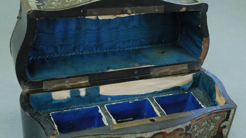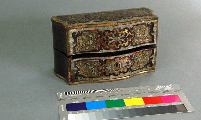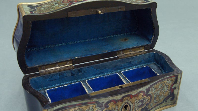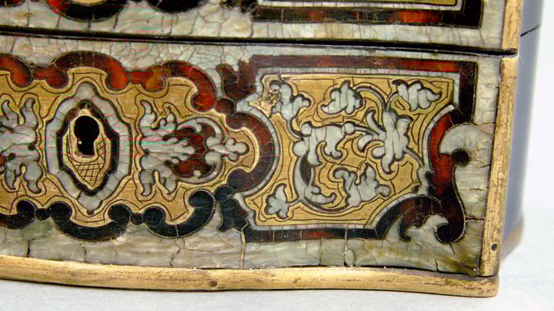 This is a mid-19th century Serpentine Toiletry Casket with Boulle style marquetry. The box has engraved brass and red turtleshell inlay on what looks like a mother-of-pearl background. However as you can see, the surface has many cracks that are typical of early cellulose nitrate plastic.