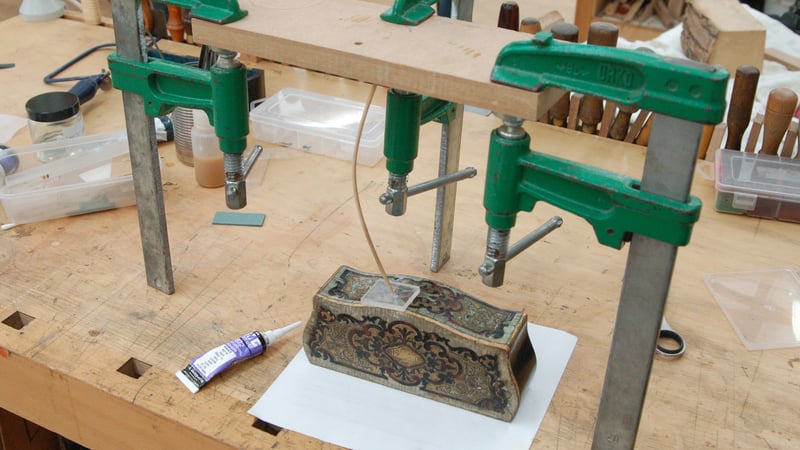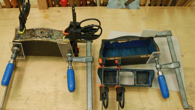 There were splits in the wood that I re-glued with fish glue, then held between clamps to dry. Fish glue is a little less strong than animal glue, which is normally used on furniture, but because this is just a small box I chose fish glue because it is easier to control and has a longer open time.