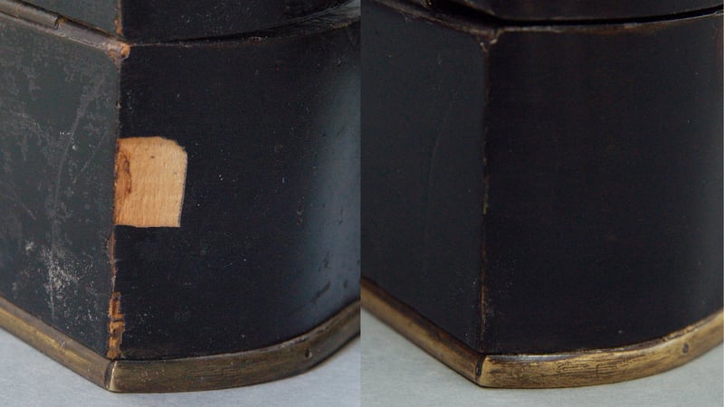 Here on the left, you can see that a piece of veneer is missing. On the right, I filled this loss with boxwood and colored it with acrylic paints and coated it with shellac. I also applied shellac over the entire ebonized veneer to compensate for the missing finish.
