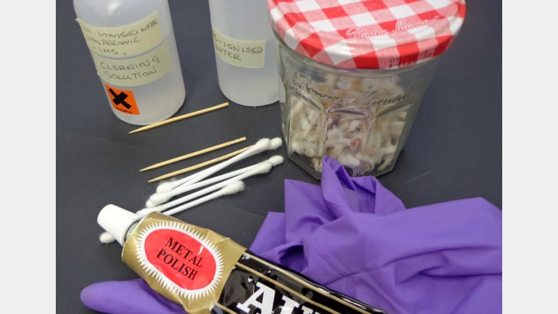 The treatment began with removing the old rivets; some came away with very little pressure whilst others required an application of small pieces of cotton wool soaked in deionised water and placed on the plaster-type substance which was holding the rivets in place. This was then covered in cling film and left for about 30 minutes. This softened the plaster enough to allow the rivets to be gently removed by hand.