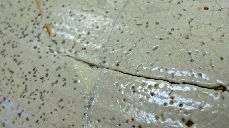 I chose to do most of the fills in the pale off-white background colour and the green of the tree. This worked well using the same approach as the reverse with the bulked Araldite 20/20 and dry powder pigment. I was very careful during this process not to fill any "old" areas of loss such as chips with ingrained dirt on the rim as they formed part of the object's history which does not affect the stability of the object.