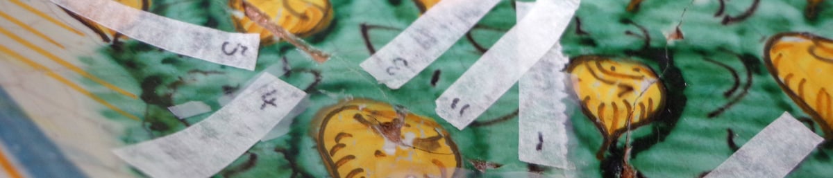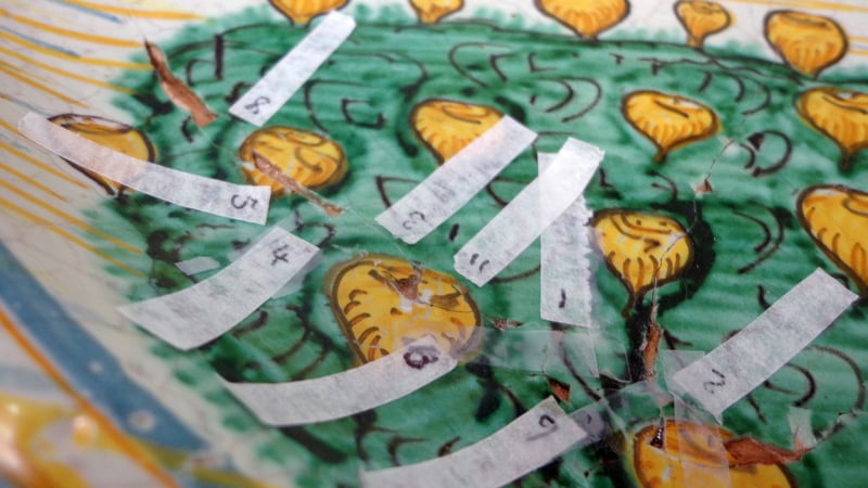 After removing any excess adhesive the next stage was to place all the small shards on both the front and reverse of the dish. Due to their size and close proximity to each other I decided to tape them in place using tiny numbered tapes so I could identify them all after placement, which was not always easy.