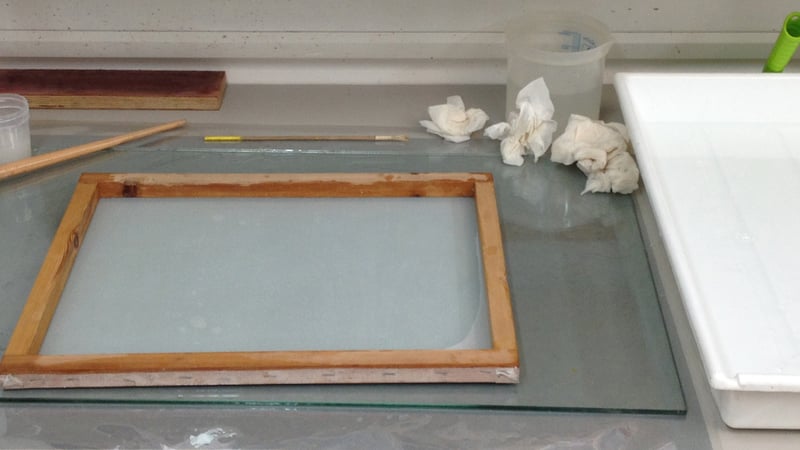 For each sheet of Japanese tissue, the adhesive mixture was laid down onto a Melinex sheet using a screen printing screen and squeegee. The tissue was then placed onto the thin layer of adhesive mixture, avoiding bubbles and brushing away wrinkles.