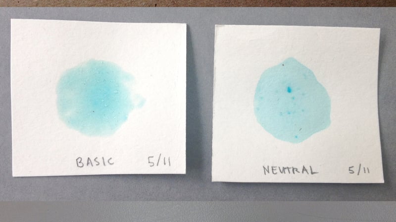 Before applying any adhesive to my tissue, I needed to dye it to match the chart's range of colours. The purpose of this colour matching is not to fool the viewer into mistaking the repairs for original material-the tissues simply needed to be shaded to avoid visual interruption, while also being an unmistakable addition. (Anyway, achieving a perfect colour match of the opaque chart would be nearly impossible on the partially transparent Japanese tissue.)