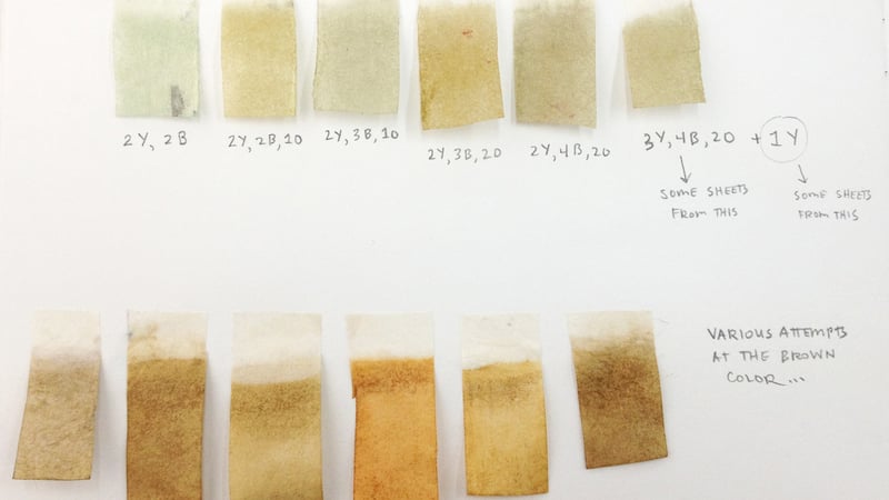 I used Cartasol® paper dyes 20% v/v in water, and dyed a series of sheets in a wide range of greens and browns.