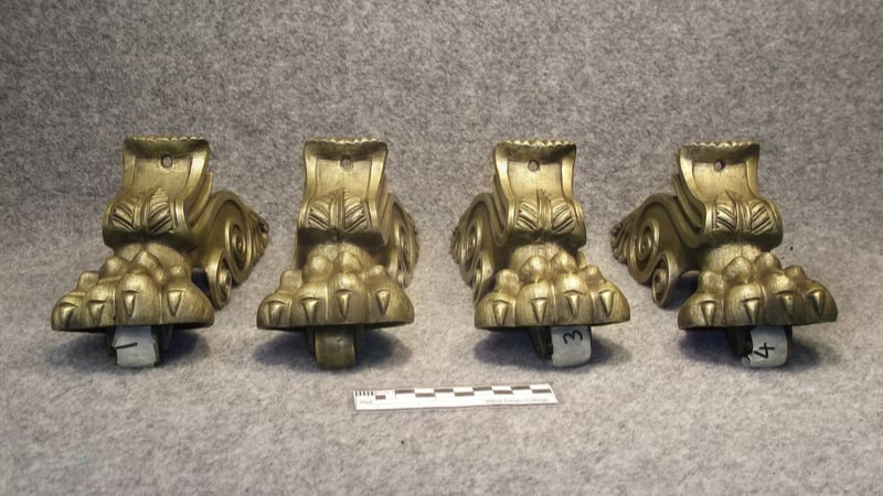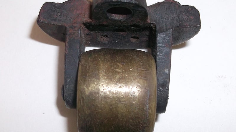 I decided to opt for a shellac coating with a variety of pigments, this was so once back in situ the casters will hold their new patina, inhibit corrosion and continue to match the object that they are going to be reattached to. I started off with a strong concentration, and made a variety of tones at different shellac thicknesses to see what would gradually coat the best. Turmeric and a Windsor green was the choice creating a light but gradual colour. Three coats of shellac, followed by two coats of microcrystalline wax to matt the surface, produced the final result.