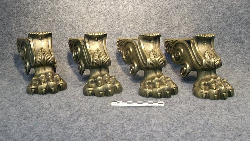 They display overall general wear and minor bright scuffs from being situated in a public area. The second caster was missing and had a wooden (lignum vitae) replacement. A thick natural patchy oxide patina covers all surface areas.