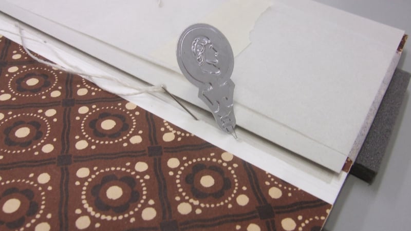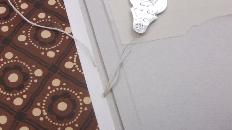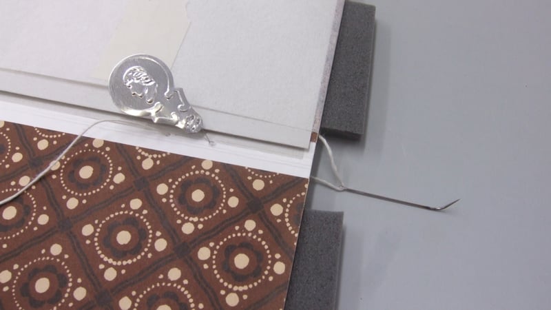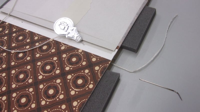 I now had a structural copy of the Royal Jubilee that I could manipulate with impunity. This enabled me to see that if I could somehow support the cover opened flat, this would allow the covering paper to lift away from the spine, and let a needle pass in and out without piercing the decorative paper. My tutor suggested that using a curved needle would make sewing in the confined space even easier. So I paid a visit to the Metalwork Conservation department, where MA student Kate Jennings kindly heated and bashed out a range of needle shapes for me to try out, and I, watching enviously as she played with naked flames and hammers, wondered if I'd chosen the wrong conservation specialism.