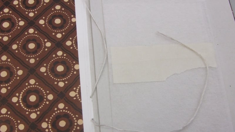 As I made a condition assessment, it became apparent that only the innermost bifolia were badly damaged enough to require repair, and that because the book is so small and light, a couple of stiches through the two pairs of original staple holes would be sufficient to hold textblock and cover together. But there was one major snag. Look again at Figure 4. When the Royal Jubilee was first put together, the textblock and cover were stapled before the decorative paper was glued over top. Now I had to figure out how to sew them back together, but with the decorative paper already in place and preventing me from accessing the spine in order to get the needle in and out. Apart from a little damage near the tail, the decorative paper was still basically intact, and perfectly well-stuck. It would be difficult to justify cutting or lifting it off for the sake of making two stitches.