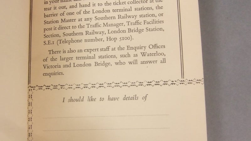If you were starting to suspect that all this is a patriotic advertising plug to lure tourists onto south-bound trains, your suspicions would be confirmed by the travel information inquiry form and fold-out map of the Southern Railway at the back.