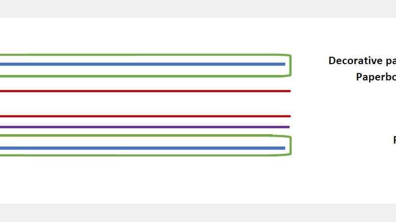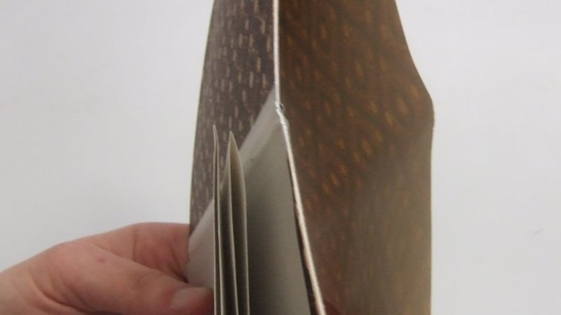 This tiny volume is constructed of a single section textblock, stapled through the spinefold to a paperboard wrapper. The fancy green and white covering paper is wrapped around the outside, and has extended foredge flaps secured inside each board by a thin line of adhesive near the gutter.