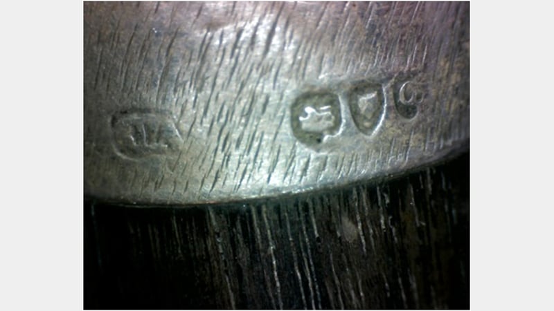 As you will be able to see in the plate above, there was a very small and indistinct hallmark. Starting from the left, the sponsors' mark will tell me who made the head of the stick. In this case the mark is quite indistinct and faded but to an expert in silverware and walking sticks it will still mean a great deal; this is something I will have to investigate further. The next mark is called the traditional fineness mark; specifically in this case the "lion passant" which indicates that the piece is sterling silver and when bordered in this shape, it's the mark of sterling silver for London. The next mark bears this out, as it's an impression of a leopard's head in a shield that indeed, is the mark for the London Assay office. Finally we come to the business end of the hallmark. In this case we have a vague but decipherable shield shaped border that encloses a letter "Q" with serifs.