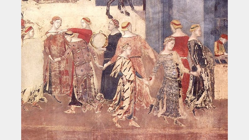 Putting her work in another context, Carole showed an image of a fourteenth century allegorical fresco by Ambrogio Lorenzetti located in the Palazzo Pubblico in Sien, specifically a scene entitled Effects of Good Government on the City Life, where a series of female figures are seen dancing, their flowing garments patterned with repeated colours and geometric motifs. The image led onto a discussion of her interest in theatre, dance and performance, suggesting how the clothed body would become a "carrier for colour", relating form and movement to colour's emotional resonances. Many of the examples in the painted clothing series suggested the work of Merce Cunningham, both in terms of costumes, stage sets and backdrops (such as those designed in collaboration with Robert Rauschenberg) and other examples formed part of performance installations in church spaces or concert halls.