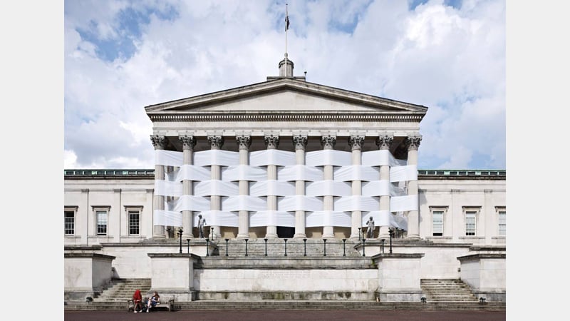 Nicolas's previous training as an architect was clearly evident in his interest in the internal construction of the image. He showed a number of images meticulously constructed using 3D modelling software, making use of the program's photorealistic power to generate detailed virtual models of both epic mountainous landscapes and humble interiors. However, the architectural influence was most apparent in his large-scale installation pieces, such as his elegant intervention in the crypt of Christchurch Spitalfields, in which carefully articulated white sheets inverted the vaulted ceiling through the use of gravity and the catenary curve, inserting a soft underbelly beneath Nicolas Hawksmoor's structure. Similarly, his intervention to the portico of University College London, adjacent to the Slade, wove white lines of permeable fabric between the columns in a pattern that suggested both ancient methods of construction and the wrappings of Christo and Jeanne-Claude.