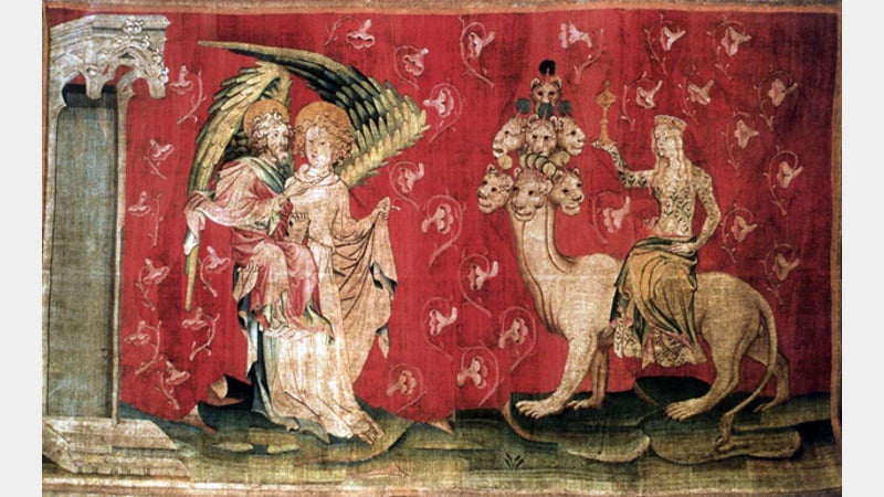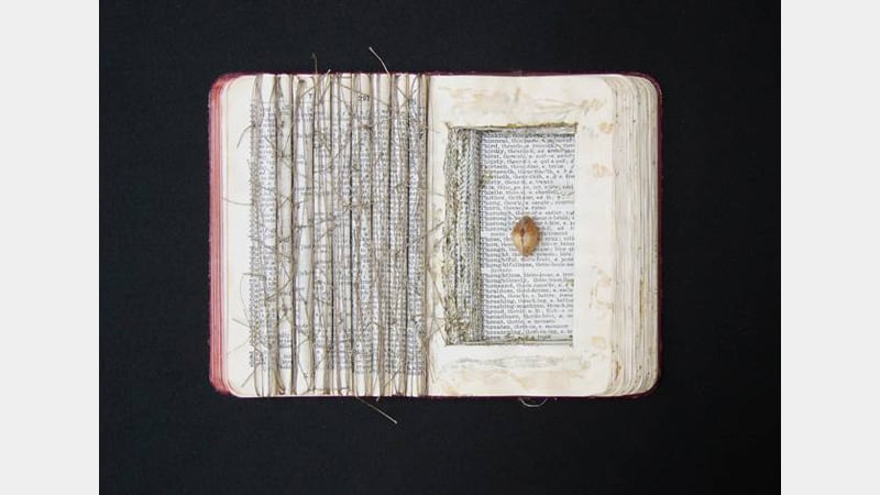 Pat emphasised her fascination for combining simplicity and complexity in her work, highlighting a bold use of colour and detailed line. She made frequent reference to weaving being a form of handwriting, the beads building up into an idiosyncratic form of script, as well as a uniquely textured surface. Again, a first departure point was described, this time the fourteenth century Apocalypse Tapestries housed at Château d'Angers in France. Yet Pat's work has passed through a number of different styles and media, from manufactured boxes containing various hoarded objects and curiosities in the manner of Joseph Cornell, to unique artist's books, refitted as static objects disrupted by the addition of threads woven through pages, or by artefacts stored within incisions. The arrangements of objects could emphasise the decorative qualities of everyday objects, echo the display of curiosities (talked about in relation to the Hunterian Museum at The Royal College of Surgeons), or touch on the subtle variations in colour and saturation that would be a continual feature of her tapestry work.