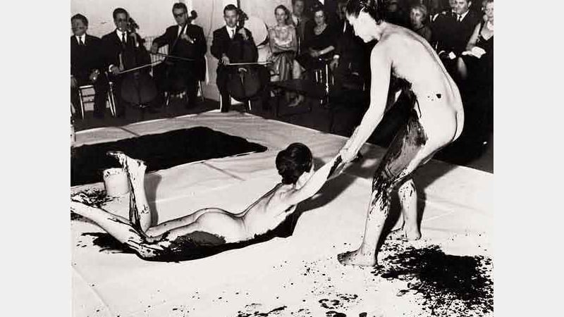 Although the corporeal was inscribed in the images to a greater or lesser extent, the subsequent processing of those initial marks often involved covering the whole canvas from edge to edge, such that a combination of the intensive and the expansive are at work in the different stages of each painting. As well as Pollock or Tobey's 'all-over' canvases, another useful reference might be Yves Klein's Anthropometries (c.1960) a series of performance-based paintings produced using women as 'human paintbrushes'. These works were both gestural and theatrical events staged in front of an audience, surrounded by signatures associated with the presence of Klein as the artist-conductor: the use of an original, artist-patented colour blue; the performance being accompanied by music Klein had composed ['Monotone Symphony' - a single note played for twenty minutes, followed by twenty minutes of silence], adding to the radical-formality of the performance.