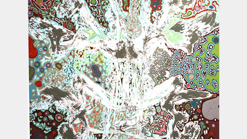 As already made clear, the body has been central to much of Teresita's work. Whether it be in the simple, repeated gesture of pigment being cupped in the palm and then systematically released across a receptive surface, it is often in a combination of controlled actions connected to semi-abstracted and aleatory results. As her practice developed, Teresita suggested that the central spurs for the paintings were no longer traumatic, but were tuned in to more ordinary experiences, especially those of reading and writing. Of course these are events too, as well as being made up of countless sub-events, and the interest is in just how thinking that passes through material parts of the body and how the constructed image can appeal to boundaries between marking and saying. A series of paintings with a cleaner, crisper approach (precise overpainting) soon emerged, still with an emphatic choice of palette with vibrant combinations of tone, again with subtle insertions of anomalous points of colour - their edges exciting one another, playing off the ground.