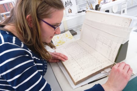 Lucy Cokes on the treatment of a green vellum account binding from the records of the Vandewall family copperas factories.