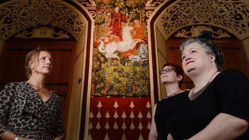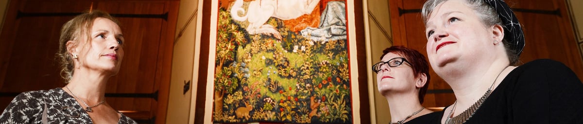 The Mystic Hunt of the Unicorn created by weavers at West Dean Tapestry Studio, part of the internationally renowned College, was unveiled today at Stirling Castle. The art tapestry is the final in a series of seven works hand woven over 14 years and commissioned by Historic Scotland to recreate The Unicorn Tapestries (1495 - 1505) held in the Metropolitan Museum of Art, New York, as part of a refurbishment at Stirling Castle. At the unveiling ceremony today were; Ian Walford, Chief Executive Historic Scotland; Lesley Ferguson, Head of Collections, Royal Commission on the Ancient and Historical Monuments of Scotland; and Alison Baxter, Head of Creative Enterprise, West Dean College.