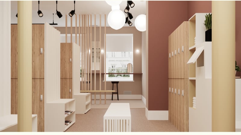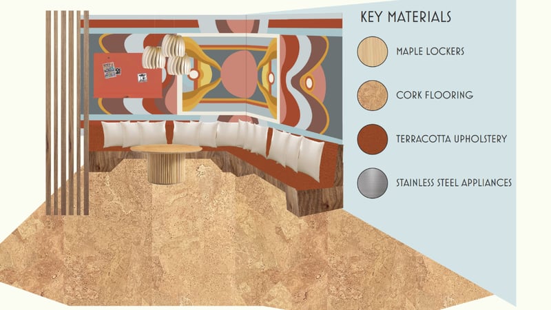 Studio Soleil (Holly Crook, Stephanie Hollaway, Miki Fallstrom, Natacha Ravier, Ana Trofin, Imi Waller) won the HE Design award for their project redesigning the staff changing areas for the Royal Hospital of Neuro-disability. They aimed ‘to make the basement a warm and relaxing space for workers to get ready for the day or to wind down from a day of demanding work.’