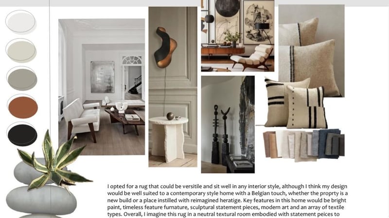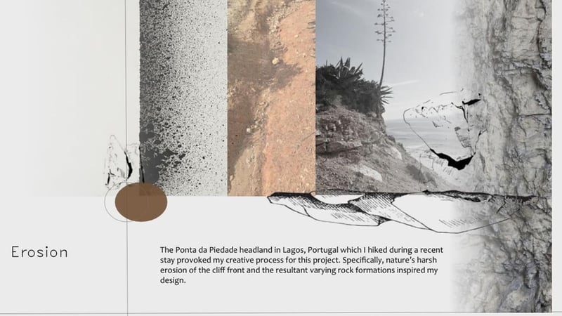 The winning concept and design came from the breathtaking landscape Bobbi witnessed on a hike along the coastal cliffs in Portugal. Captivated by the natural beauty of erosion, she found inspiration from the unique shapes and textures of the eroded rock surfaces to inform the shapes, colours and materials in the collection. "Throughout my creative process, initial sketches led me through a myriad of designs. I enjoyed experimenting with not only shapes but different pile types and depths. The combination of these elements truly brought the concept of erosion to life within my design." Bobbi comes from a textiles background and combined these skills with her knowledge from the Interior Design diploma, bringing them together to create this stunning collection.