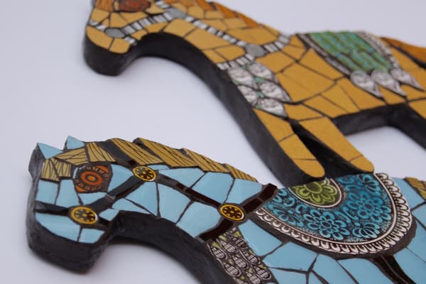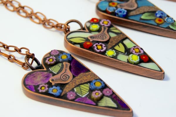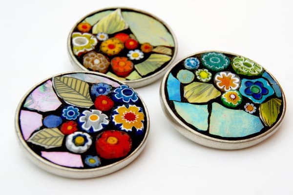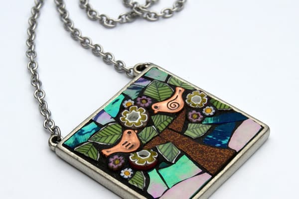 Unique hand cut mosaic jewellery and interior pieces, created with iridescent glass, vintage ceramics and Italian millefiori. Angela's mosaics are inspired by nature, folk art and style movements, creating decorative and attractive pieces to wear and for the home. Mosaics make an effective and durable solution, through picking, cutting, laying and combining materials. The art form reacts with its environment with light reflection giving an extra fascination.