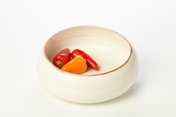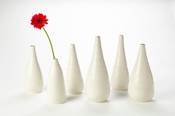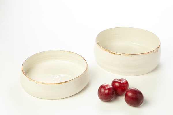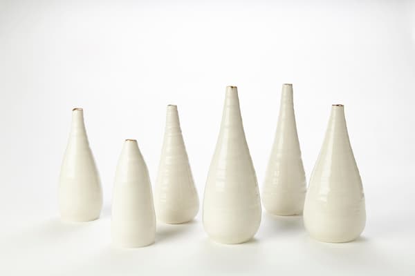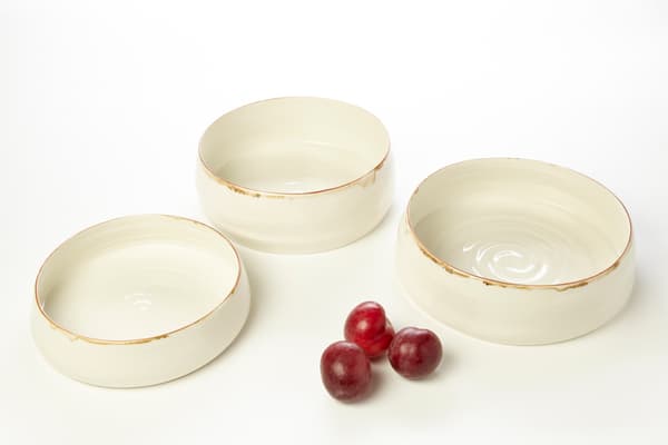 Kirsty Adams trained with a pottery in Western Japan after studying in Brighton. She now works from her studio in Newcastle-Upon-Tyne. Her work is thrown and decorated with subtle brush marks and layers of poured glazes. Each piece has a feeling of spontaneity, delicacy and fluidity. Her bronze lustre rim porcelain pieces are fired three times to achieve a creamy gloss glaze with oxide and bronze lustre rim detail.