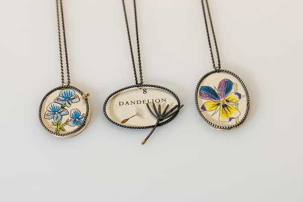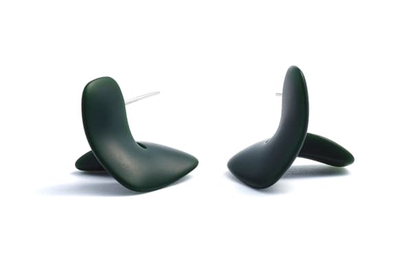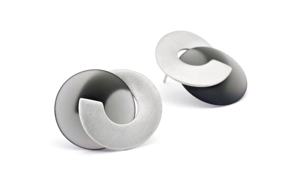 Lesley’s inspiration predominantly comes from natural forms although her recent work has been influenced by the sculptors of the 1950’s. The sculptural language of a range is the first stage of her design process, the finish is designed to give the wearer a very tactile and intimate relationship with her work. She uses traditional jewellery techniques and hand thermo-forming.