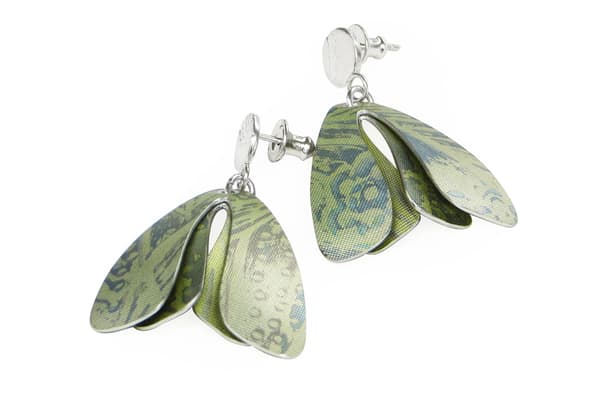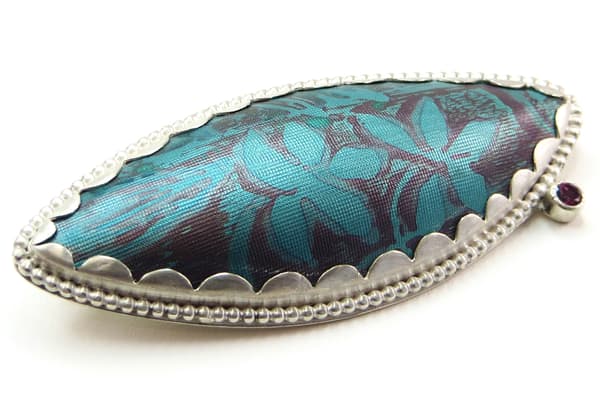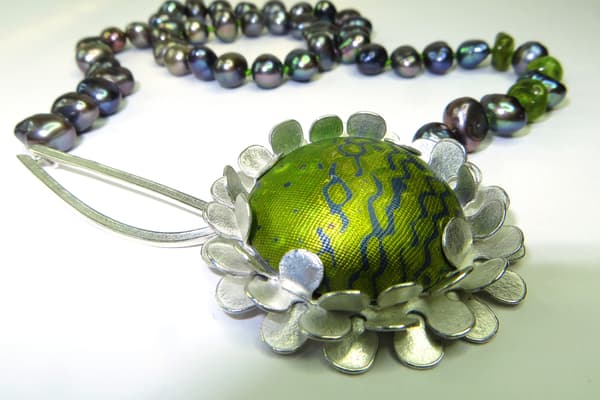 Dominated by the use and perception of colour, Lorraine uses traditional print-making techniques on aluminium, to produce unique raw material. Her interest in the history of textiles influences surface designs and textures. Lorraine’s use of form is usually traceable to flora and fauna. Currently her studies are of cacti and succulents, their statuesque shapes, fantastic flowers and deceptive surfaces lure her into layering metals and stones to capture something of their individuality.