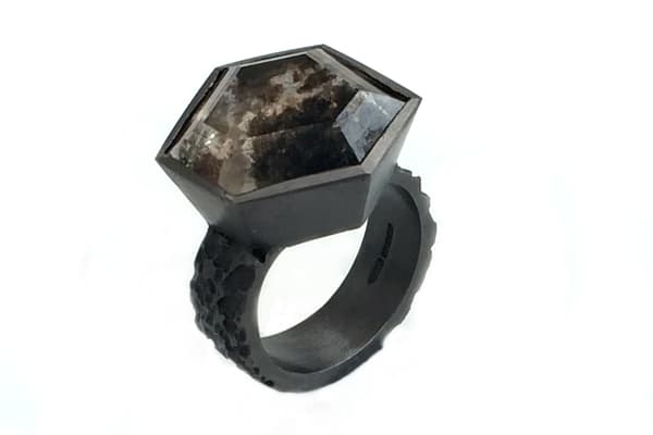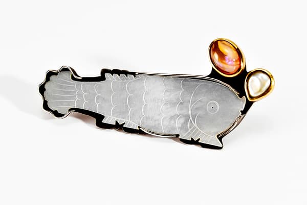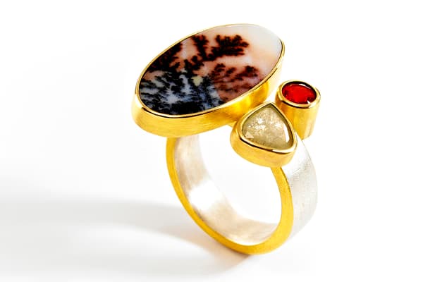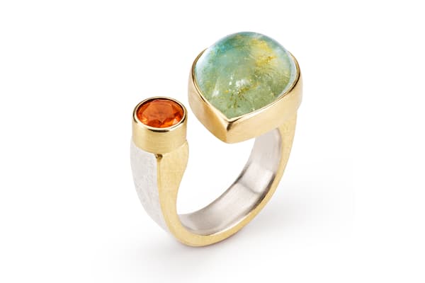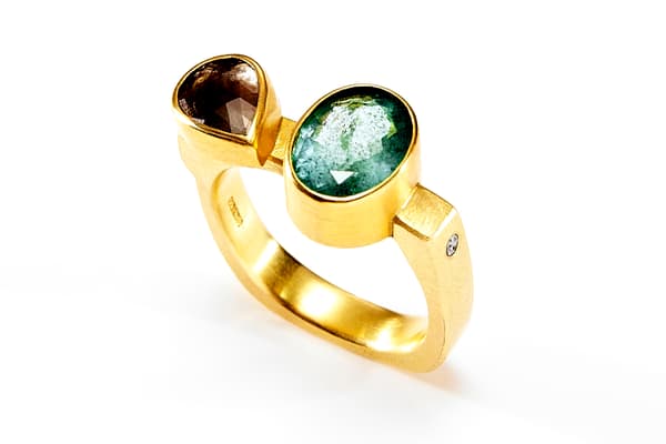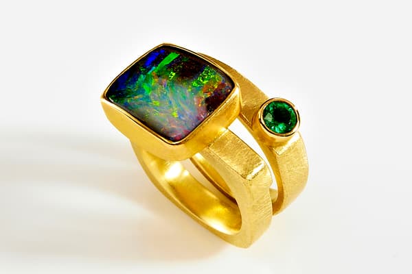 Tanja's work focuses on individual silver and gold pieces with a wide range of unusual gemstones, such as rough diamonds, opals and mineralised quartzes. The often structural and heavy rings are lightened by the vibrant colour of the gemstones and the fine gold Kumboo (a Korean gold fusing technique) on the edges. The recent series of brooches contrasts vintage pieces and found objects with fine gemstones.