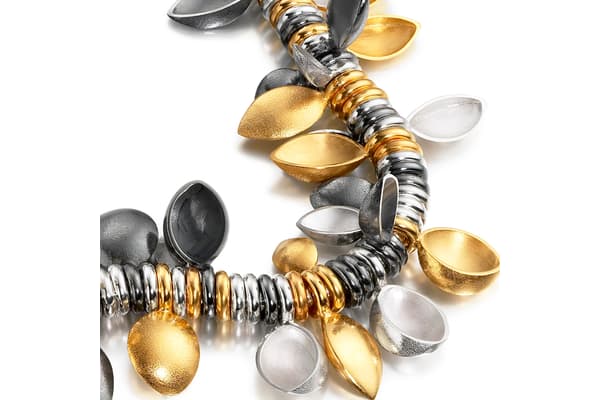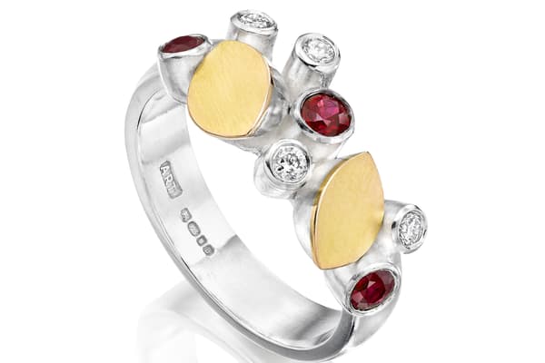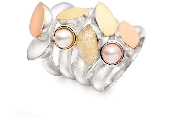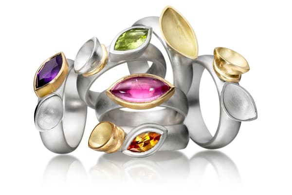 Annie’s jewellery is inspired by natural organic shapes found in marine life and geology. The latest collection juxtaposes open and closed forms offsetting smooth matt gold and silver flat surfaces with hollow polished edged elements. Precious stones and beads have been incorporated within her collections to enhance the sculptural forms with colour. In all of her work there is a strong emphasis on three dimensionality of design.