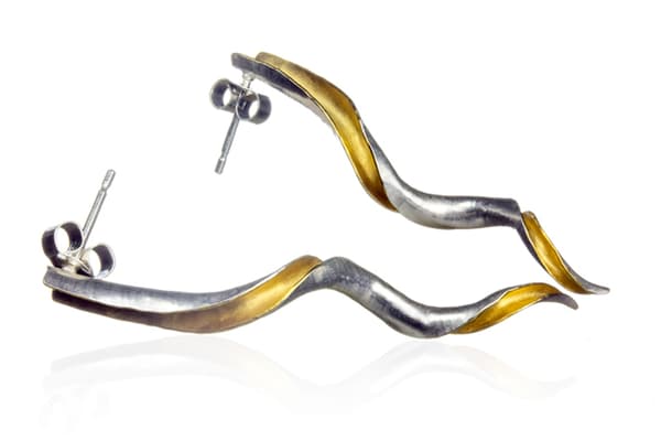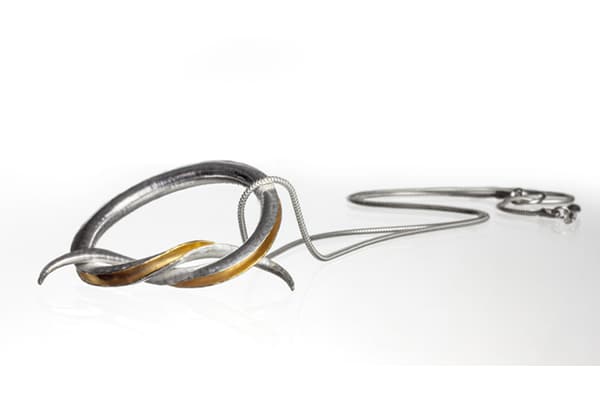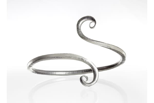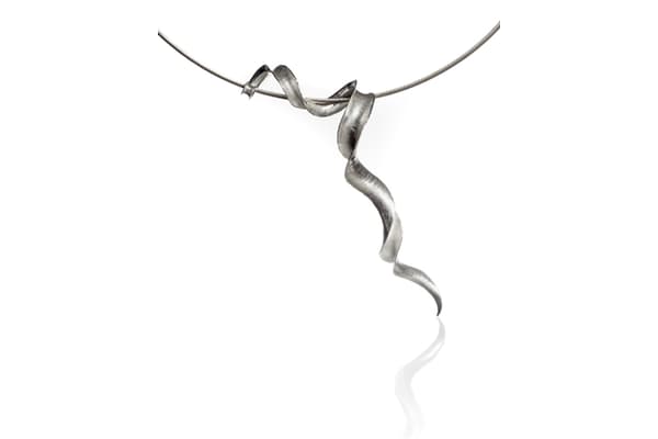 Anne makes sinuous, seductive contemporary silver jewellery, inspired by the natural world. Design is carried out directly in metal rather than on the page. Each piece is hand-hammered using the technique of anticlastic raising, which gives light, strong, easy-to-wear forms. Many designs feature hammered texture; some have integral pins, catches or loops. Both inner and outer surfaces are displayed; some inner surfaces are gilded for contrast.