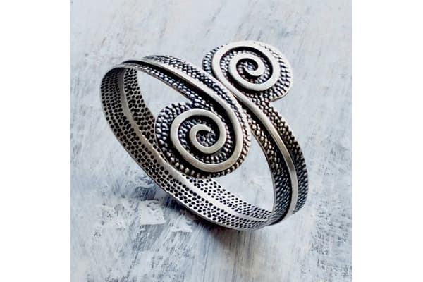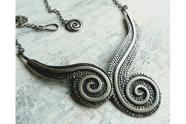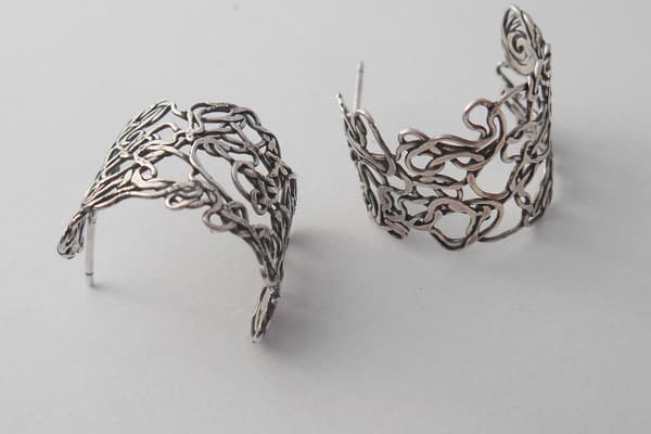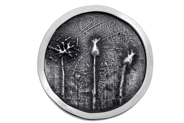 Plants are my main inspiration. For source material I collect examples and take photographs. I either cast the piece itself or I do drawings abstracting the main elements to create a design that I can fabricate in metal. I work with metal sheet, using piercing, repoussee, hammering or roll milling to give the desired shape and texture. To finish the piece I polish it and use oxidizing to enhance texture.
