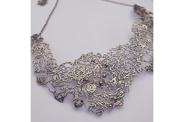 Charlie's work largely evolves from the influences of nature and its structures. Leaf skeletons, seed pods, droplets; their appearance is one of fragility yet they have an inherent strength and resilience. Thus her work follows an intricate aesthetic with interwoven structures and delicate elements reoccurring and combining to form a greater impact and larger final piece.