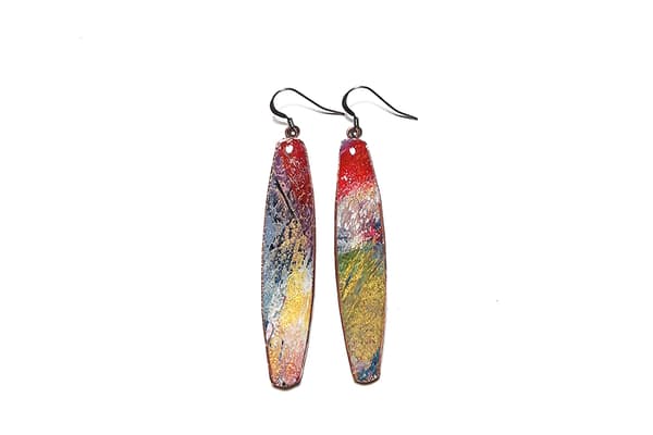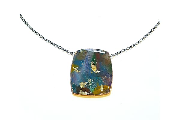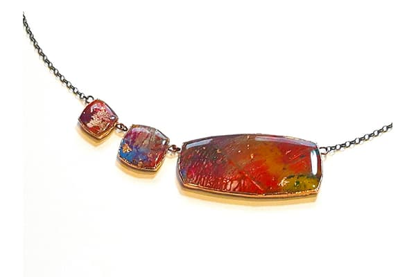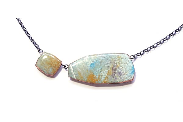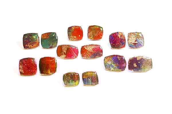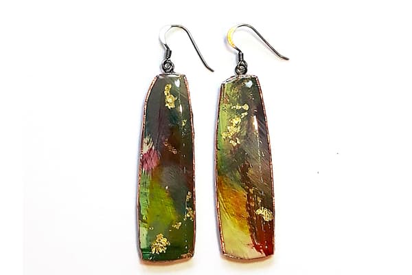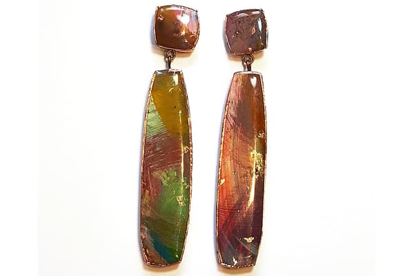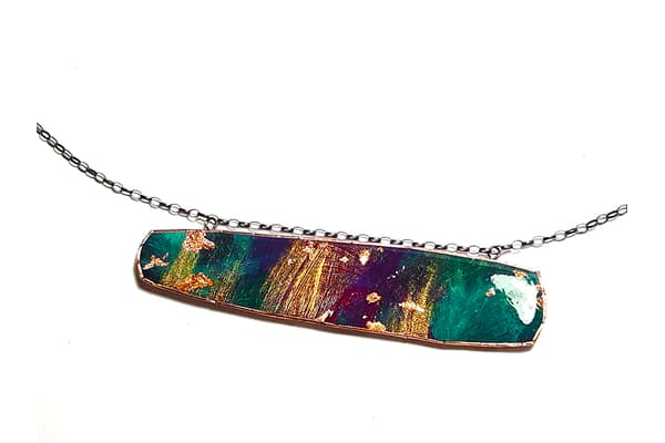 This mixed media collection originates from a range of abstract paintings using acrylics, oils, pastels, gold and silver leaf with an emphasis on texture and detailed layers of colour. The paintings are cut into shapes, edged in copper and coated in resin. Once dried, the pieces are backed, embossed with pewter and assembled into a unique, limited edition range of brooches, pendants, necklaces and earrings.