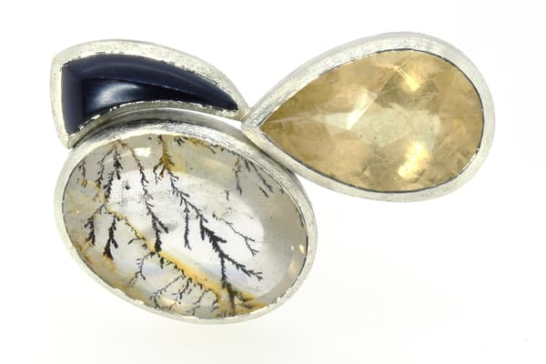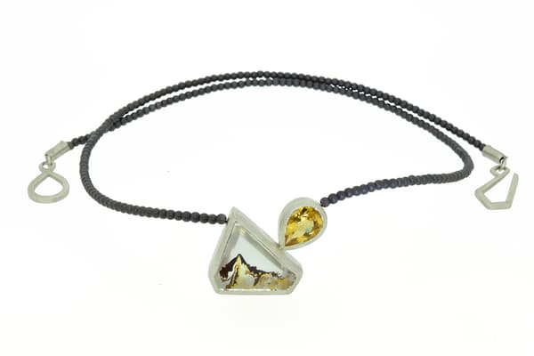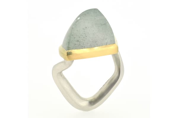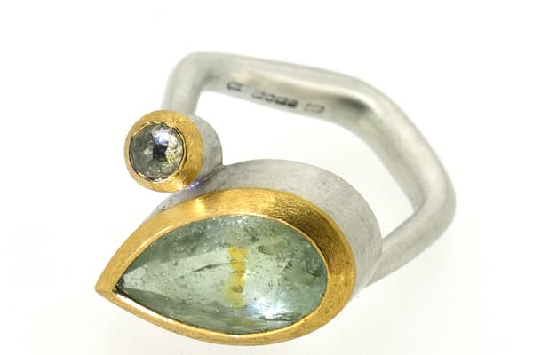 Emily uses the simplicity of line and natural form to create ergonomic, wearable stone set art objects in precious metals. The gem material she uses is carefully selected for their unique natural inclusions, some of which is pre-cut, others she carves herself to continue the sculptural element of her design through into the stone.