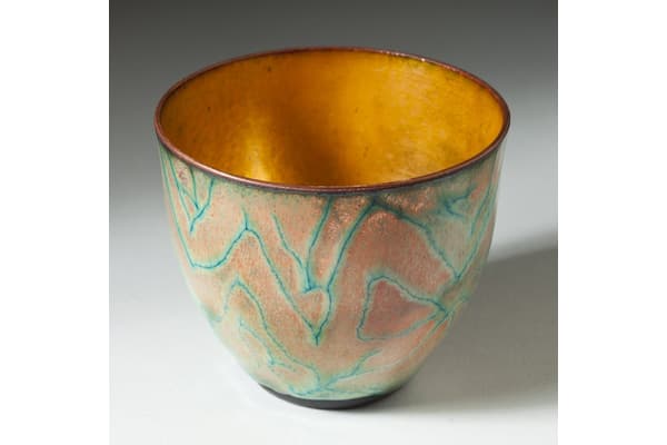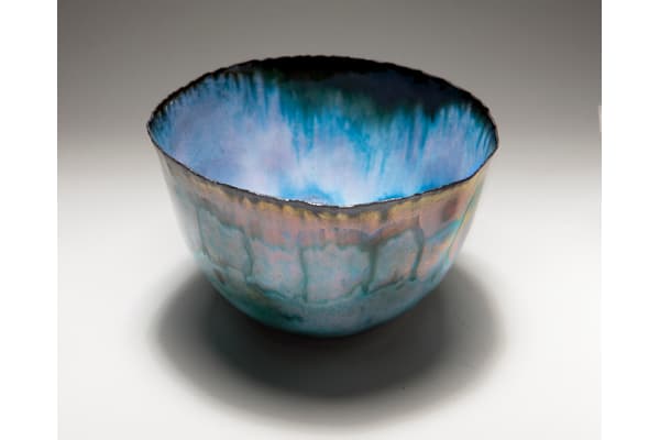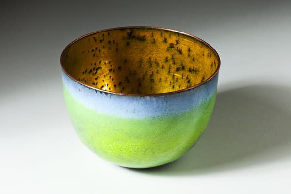 Over a long career Pat has enamelled on copper panels (work shown in the Royal Academy Summer Show) and on large scale steel panels (work shown in the Help the Aged garden and the Chelsea Flower show. In recent years Pat has concentrated on experimenting with the behaviour of enamels on copper, discovering the beautiful effects which can be achieved. These are best shown on copper bowls, .