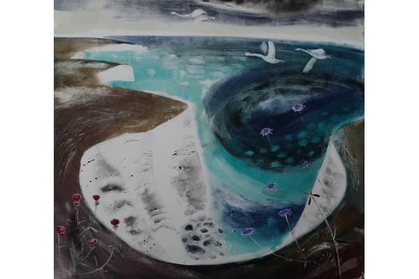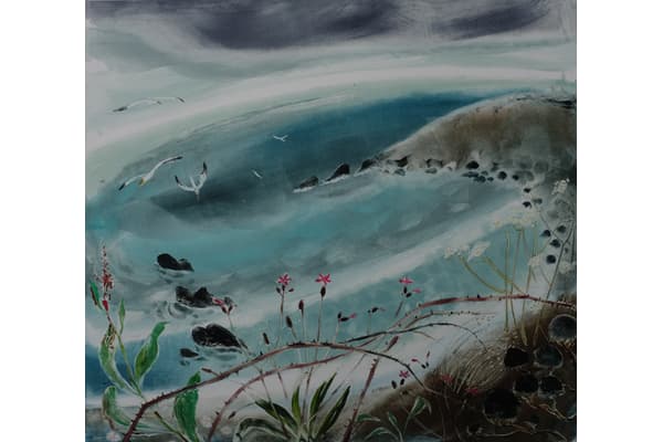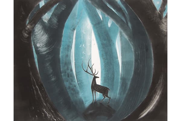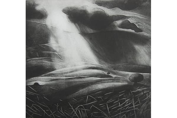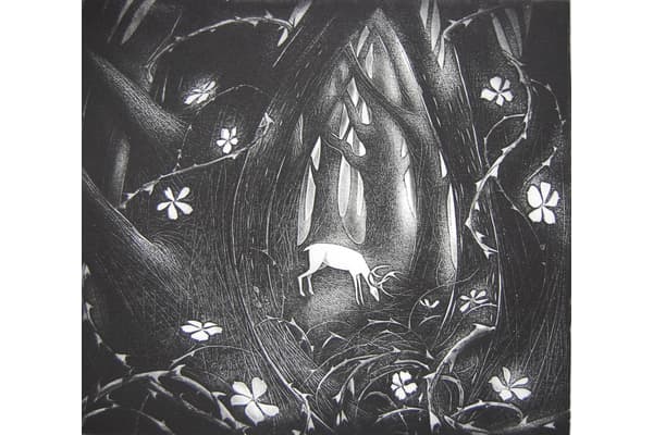 In her etchings, Flora searches the immanent places of the land for a fleeting glimpse of the white hart. She draws webs of lines into hard ground and add dark washes of spit bite aquatint, or bite heavy soft ground textures into the plate and scrape and burnish the moonshine back in. Her painterly monotypes of clifftop flowers and broad cloudshadows are glowing landscapes built from memory and observation.