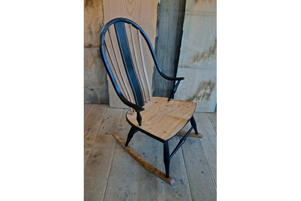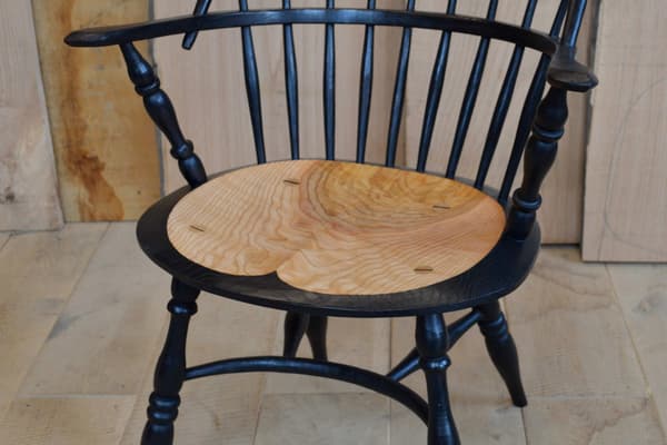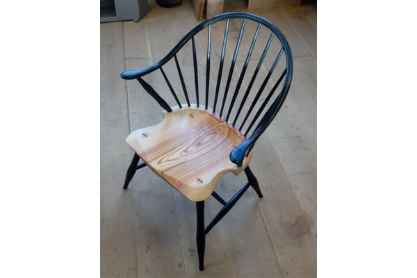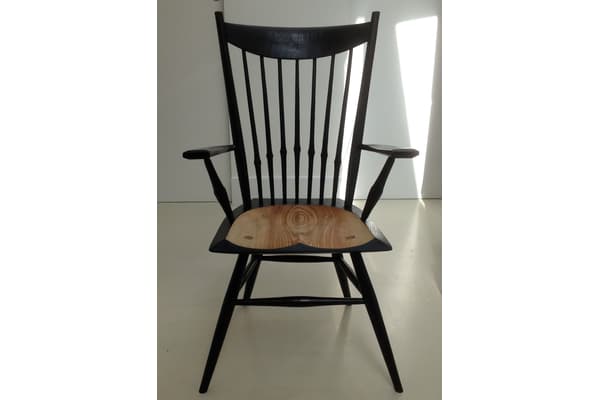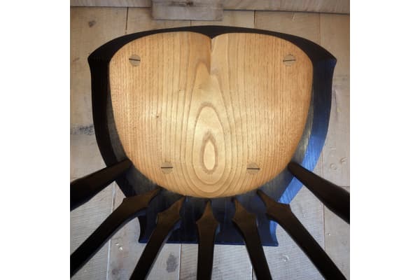 Jason makes crisp, contemporary windsor chairs from a small one-man workshop in Lewes. His chairs are both utilitarian and sculptural, whilst embodying traditional methods and using locally sourced materials. Jason uses a pole-lathe to turn legs and spindles from green ash logs, the seats are hand-carved using the adze and travisher, and many parts are steamed and bent. He paints the chairs black to enhance their graceful silhouette.