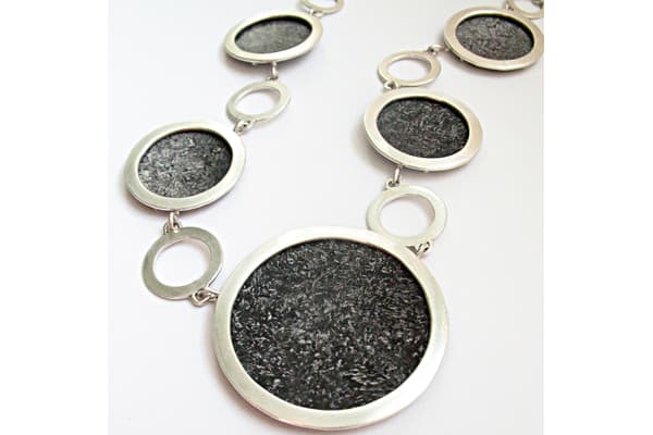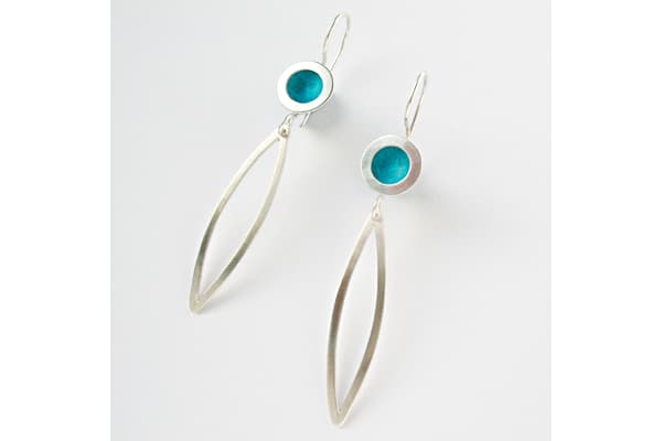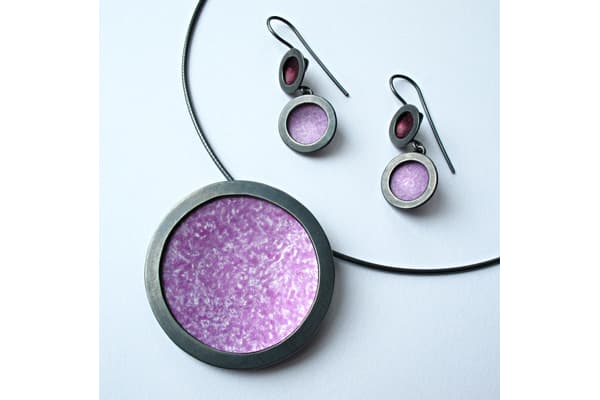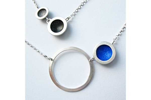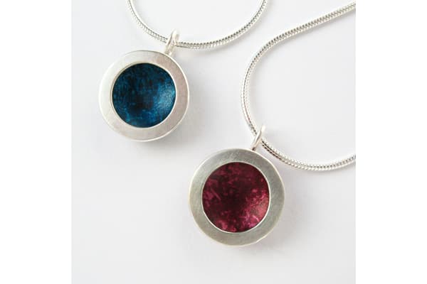 A jewellery designer for over 20 years, Penny began to use pre-anodised aluminium in 2000 to express her love of colour without the use of stones or precious metals. Ink directly applied with a brush to the aluminium surface achieving a natural wash effect of colours has become her signature style. Combined with silver she produces collections of very wearable contemporary jewellery, with a price range to suit all.