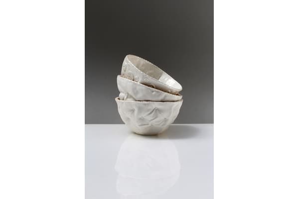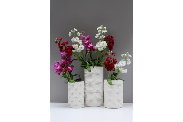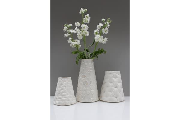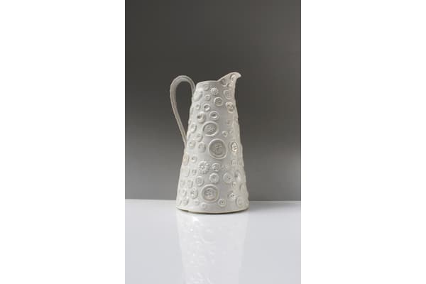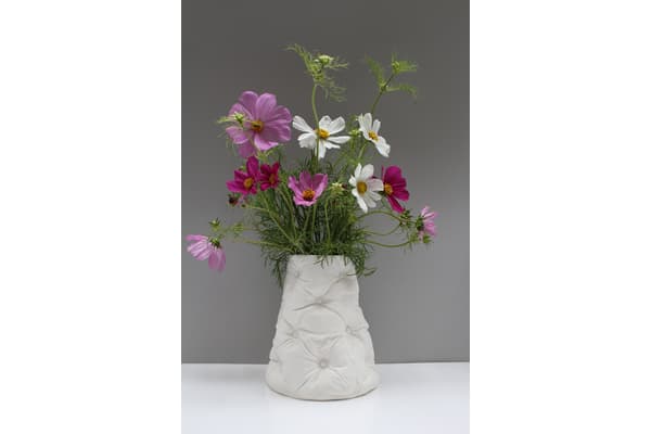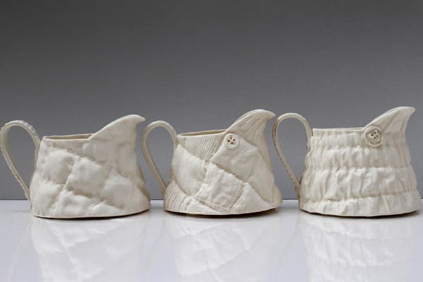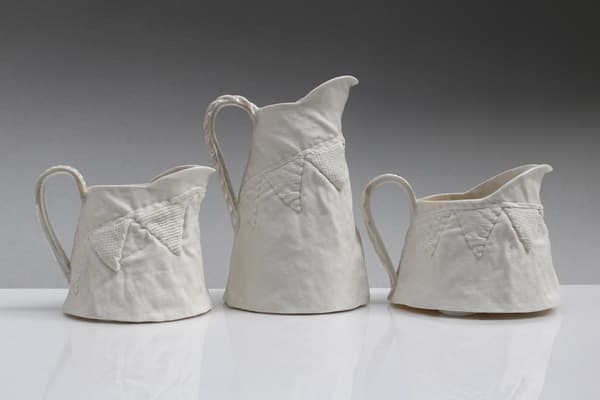 Using a range of fabric textures and techniques from sumptuous, deeply upholstered silk to thrifty patchwork and having stitched, embroidered and quilted, Sarah casts the fabrics in plaster. She can then press mould and ‘tailor’ porcelain slabs to make jugs, vases and lamps. Her work references a history of textiles and domestic interiors and has been exhibited and sold throughout the UK including the V&A shop and internationally.