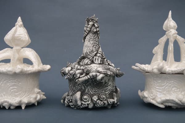 Tamar's porcelain is born of a fascination with dramatic forms. She is especially drawn to skylines and city scapes where horizons and silhouettes present domes, minarets and towers. Similarly the drama of natural objects such as shells and animal skulls inspire me to make and record a moment in time. Tamar's work in porcelain paper clay, using a combination of hand building techniques-rolling, impressing, sprigging and moulding.