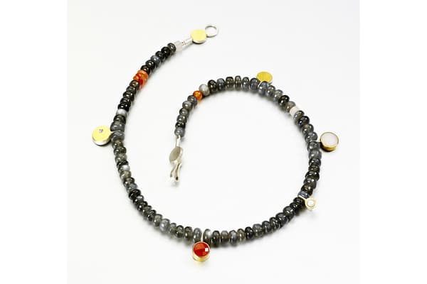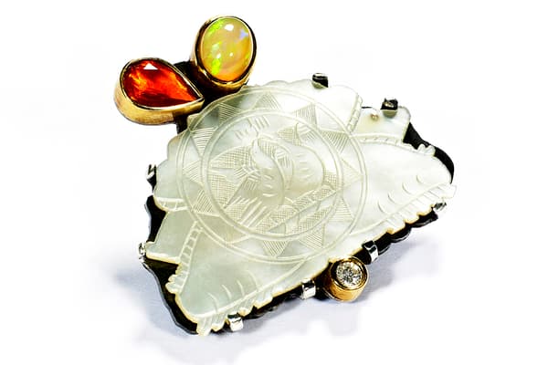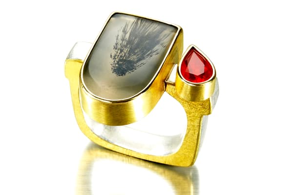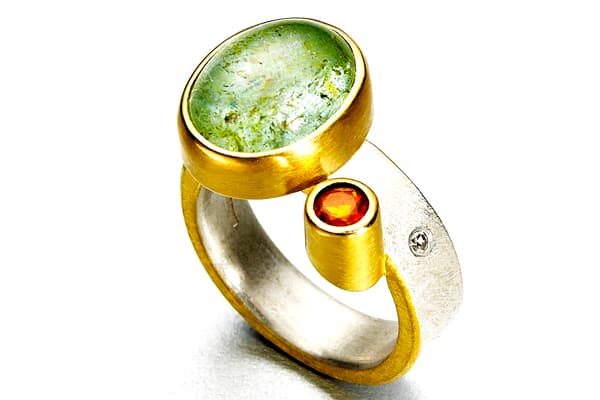 Tanja's work focuses on individual silver and gold pieces with a wide range of unusual gemstones, such as rough diamonds, opals and mineralised quartzes. The often structural and heavy rings are lightened by the vibrant colour of the gemstones and the fine gold Kumboo (a Korean gold fusing technique) on the edges. The recent series of brooches contrasts vintage pieces and found objects with fine gemstones. She exhibits worldwide, including the New York Now Fair, Goldsmiths Fair London, Inhorgenta Munich and many European Countries.