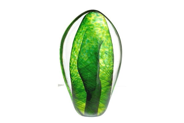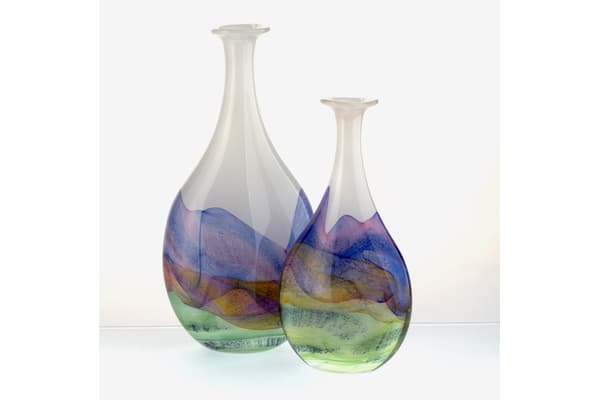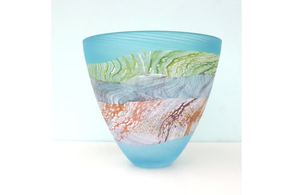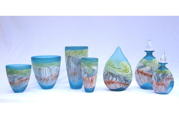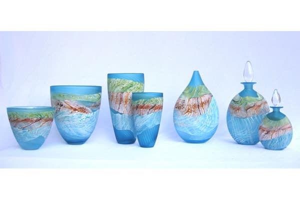 Decorative hand blown glass depicting abstract patterns and land/seascapes in the form of bowls, vases, stoppered bottles and paperweights. Some pieces are sandblasted to give them a matt effect. There are also blown/fused wall art panels made from the blown pieces.