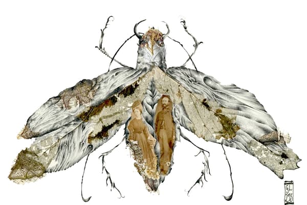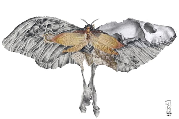The Victorian era is of great inspiration to my artistic practise, specifically their passion for collecting curios and preserving life’s memories in unique forms. This inspiration has lead me to assemble my cabinet of curiosities; horns, antlers, insects, taxidermy animals, letters, poetry books, antique maps, ambrotype photographs and dried flowers are amongst just some of my hoards of collected oddities. Strangely enough the word ‘ambrotype,’ from the Ancient Greek: ἀμβροτός, translates to “immortal,” ideally de- scribing themes within my own artwork. These objects that personify the transient nature of life tell their own tales which form the backbone to my artistic creations. My artistic style varies from piece to piece, delicate pencil drawings with antique collage to ‘pyro- graphed’ animal skulls with real insects cast within their bone.